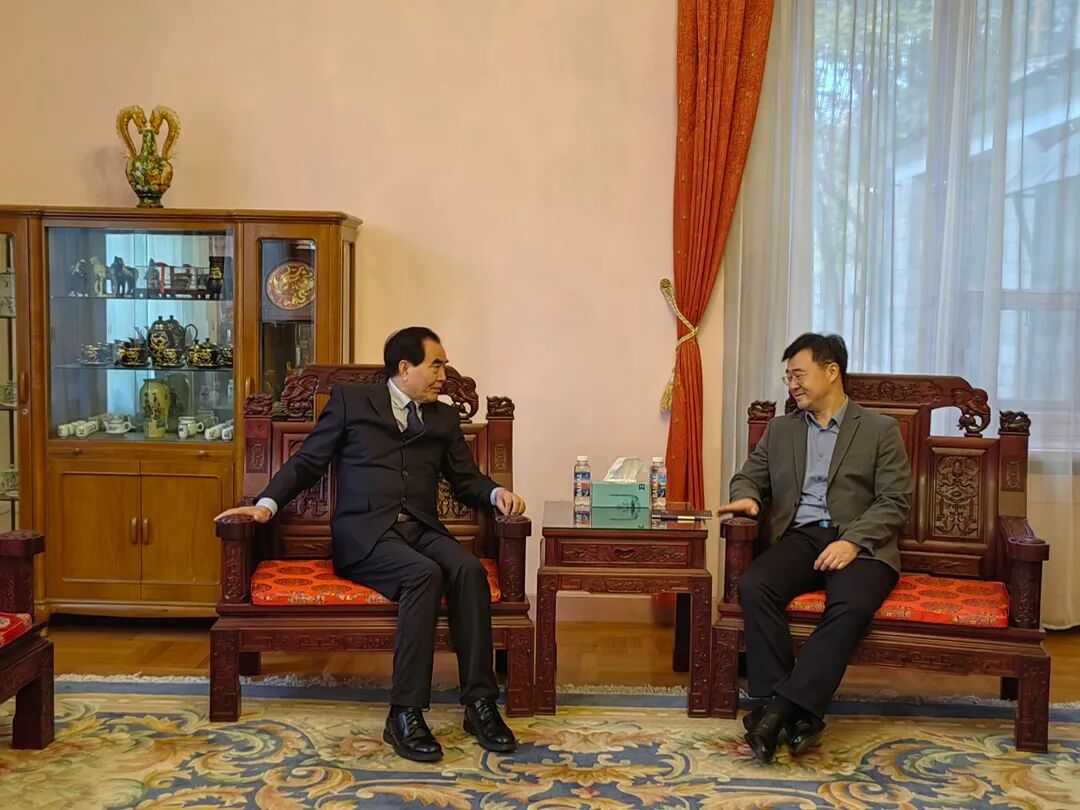 10月16日下午代表团拜会我驻俄大使馆,周宇公使衔参赞与余华荣书记一行亲切交流,共谋科技创新和国际合作发展。
